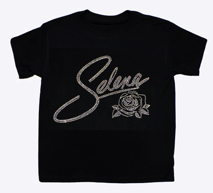 | DESCRIPTION: Youth Black Tee with Selena Logo in AB Rhinestones |